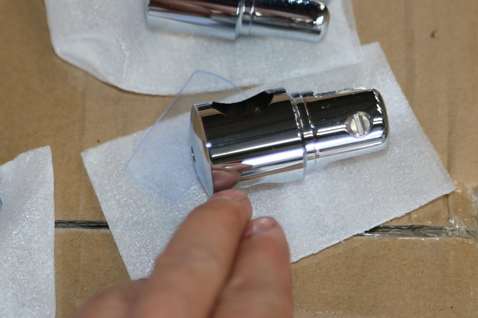 Трек вставляется в отверстие держателя. Далее держатель фиксируется на нужном месте трека с помощью винта с шестигранником, после чего в паз между лепестками ставится стекло и также зажимается винтом, прокладки не допускают прямого контакта стекла с винтами , что делает соединение более надежным