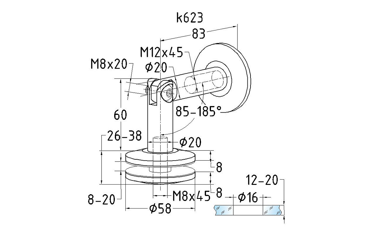 предназначен для крепления стекла к стене путем монтажа детали на шпильку М12 в стену и последующим креплением стекла от 10 до 20мм.
