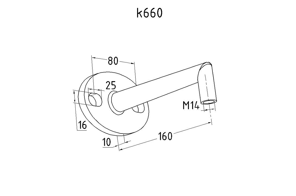 Держатель для подвеса стеклянного козырька (Соединение стена- рутель). Литая, полированная деталь, выполненная из стали AISI 304. Состоит из фланца толщиной 10 мм и шириной 80 мм и дистансера с резьбой М14. Размер дистансера 160 мм от стены до центра отверстия. На основании имеется два овальных крепёжных отверстия размером 16,5 на 25 мм.