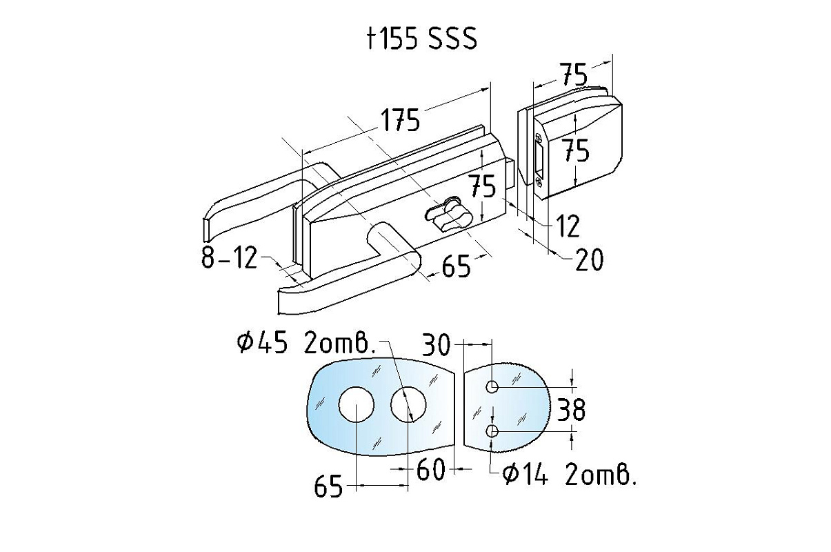 t155 SSS Замок с нажимной ручкой без притвора, евроцилиндр односторонний ключ/защелка, в комплекте ответная часть на стекло.
