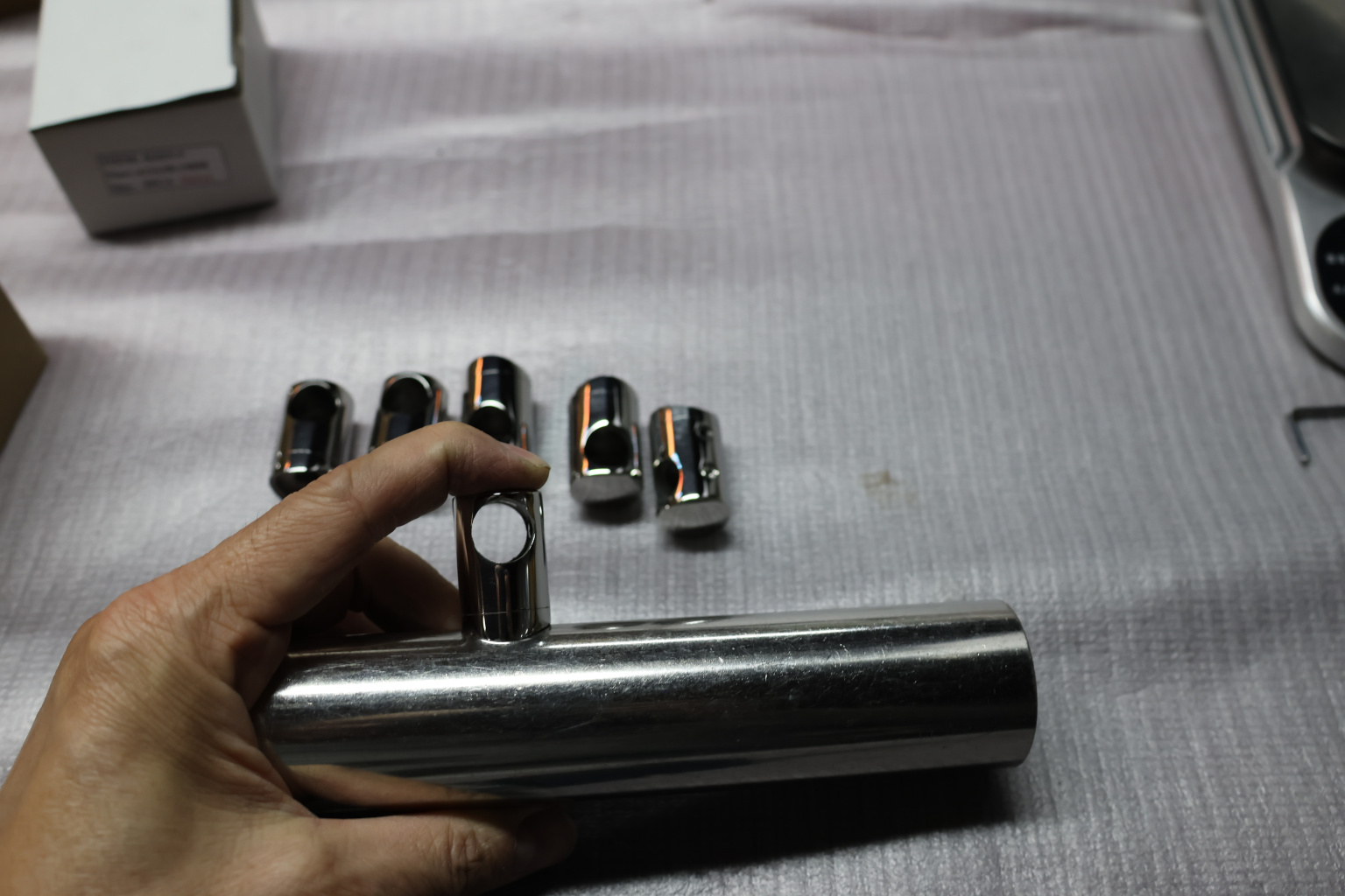 Ригеледержатель на стойку Ø38.1 мм, для ригеля Ø12 мм, Деталь полированная, литая, разборная. Фиксация ригеля с помощью шестигранника