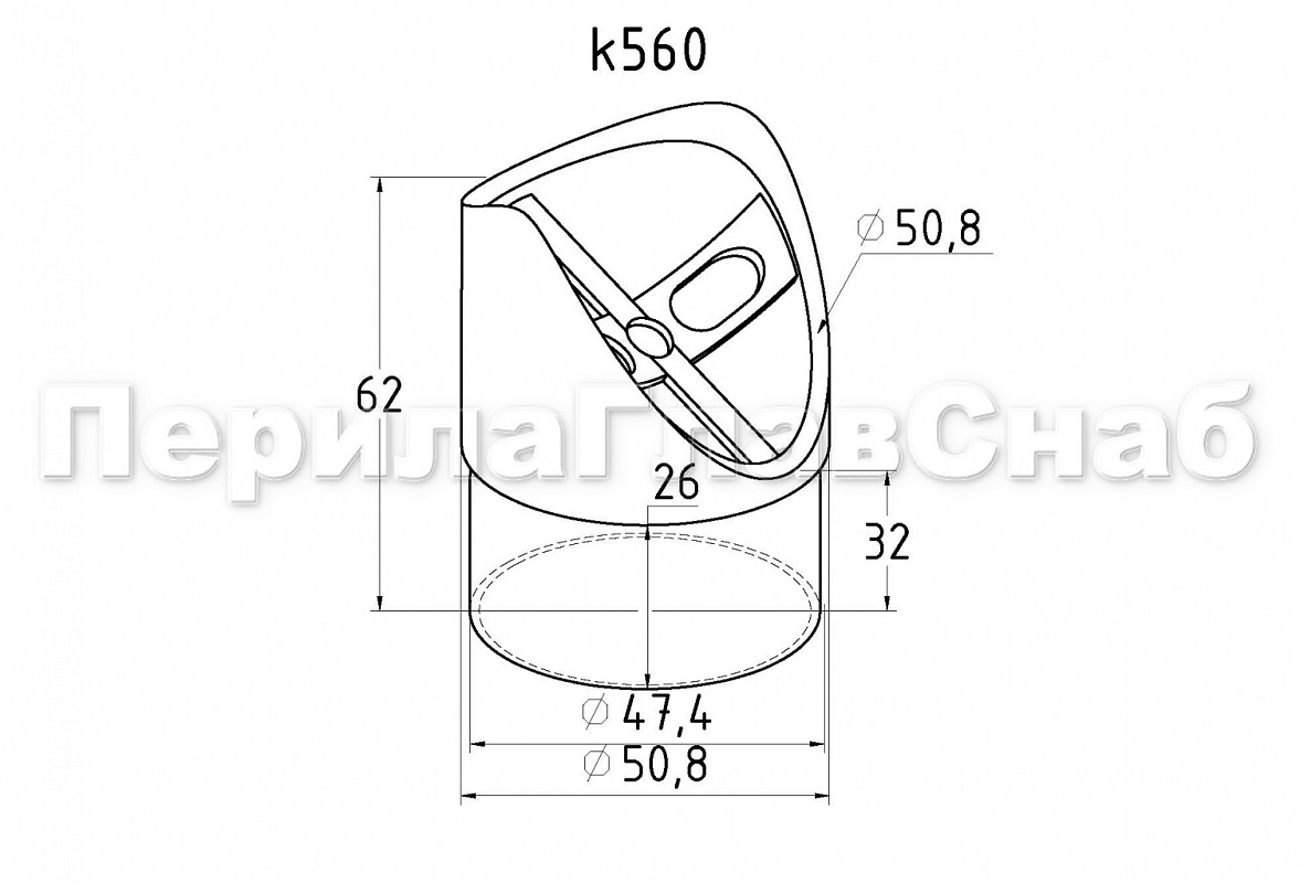 Наконечник седловина косая 30° на стойку Ø50.8 мм, под поручень Ø50.8 мм, литая, полированная, AISI 304, k560