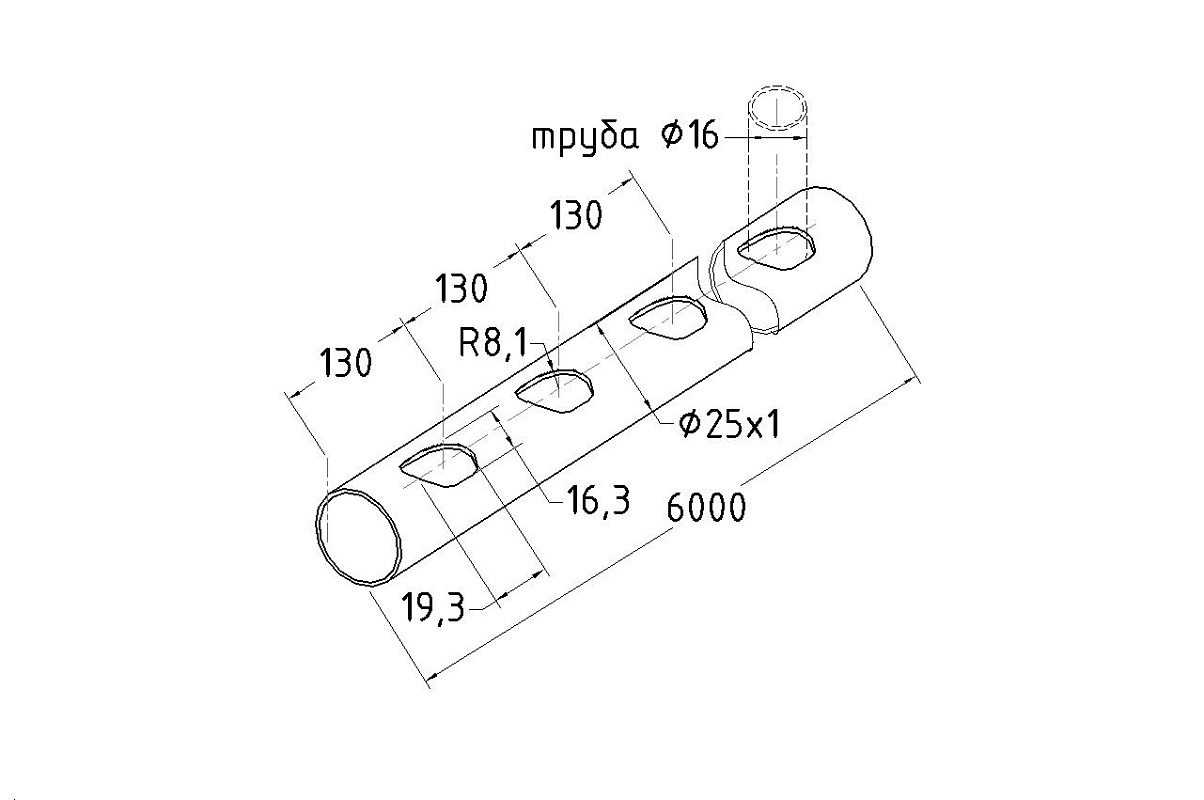 Труба AISI 201 25х1х6000, с перфорацией под Ø16, 30°, GRIT 600 831-5
