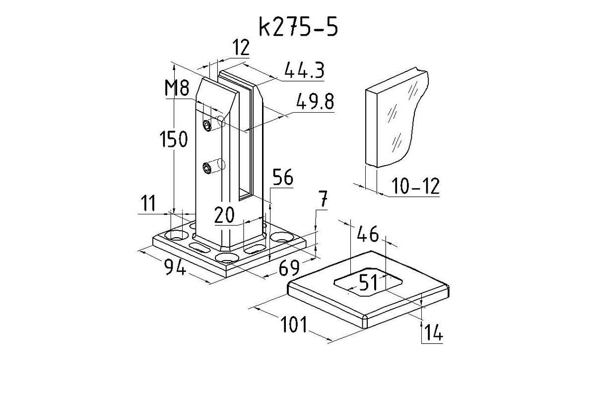 стеклодержатель предназначен для создания ограждений со стеклом 10-12 мм С-8085-2 у бассейнов и кровли. Внутренние вставки в стеклодержателе приклеены, можно отклеить самостоятельно.