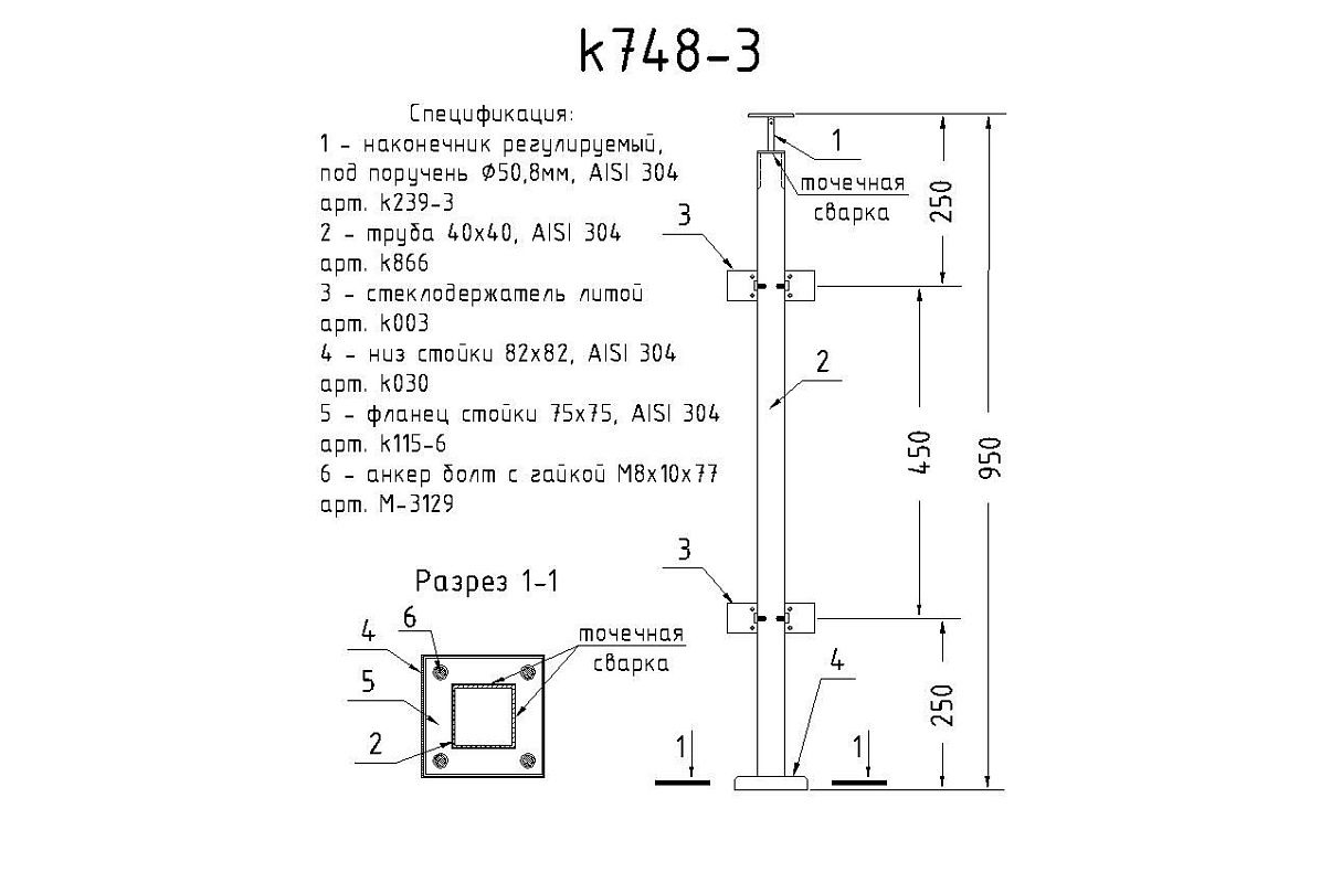 Стойка квадратная 40х40: 4 литых квадратных стеклодержателя, шлифованная, высота 950 мм (AISI 304) k748-3