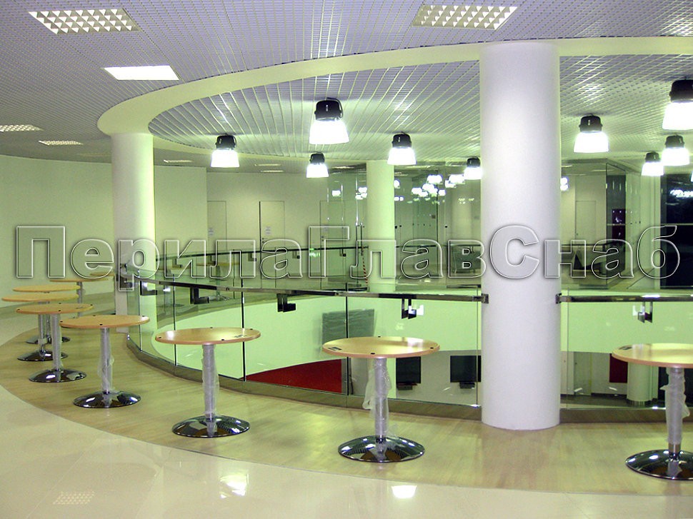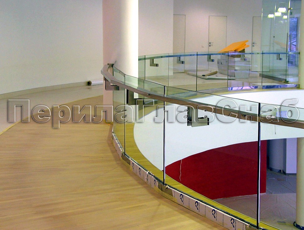 Ограждение со стеклом и цельностеклянные перегородки на заднем плане.Обратите внимание, часть стекол ограждения соединяет пол и потолок по всей высоте, при этом образуется поворот ограждения по радиусу атриума, а уходит в качестве стены на офисную часть помещения.