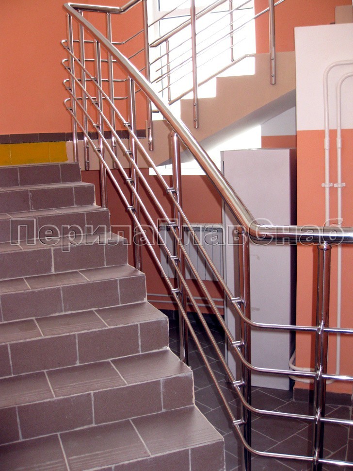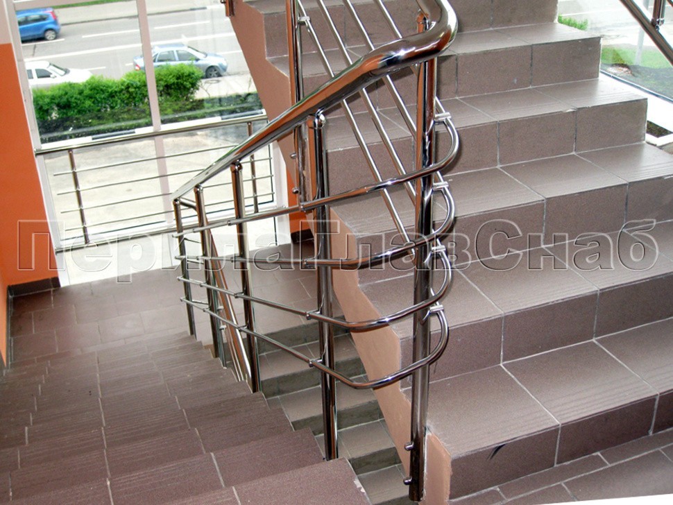 Перила из нержавейки вдоль окна и лестничного марша.Слева ограждение окна, а справа ограждение лестницы.Характерной особенностью ограждения окна является тот факт, что у него сразу два поручня.Верхний поручень служит для утилитарной и вполне традиционной цели — опоры руки идущего по лестницы человека. А вот второй (нижний) поручень нужен для опоры несущих стоек ограждения, так как они завязаны не в пол, как это делают обычно, а в стены. Таким образом, ограждение как бы «парит» в воздухе, создавая иллюзию легкости и воздушности всей конструкции в целом.
