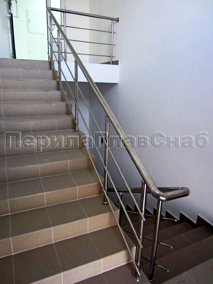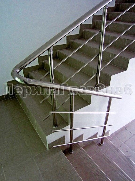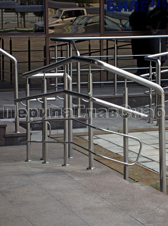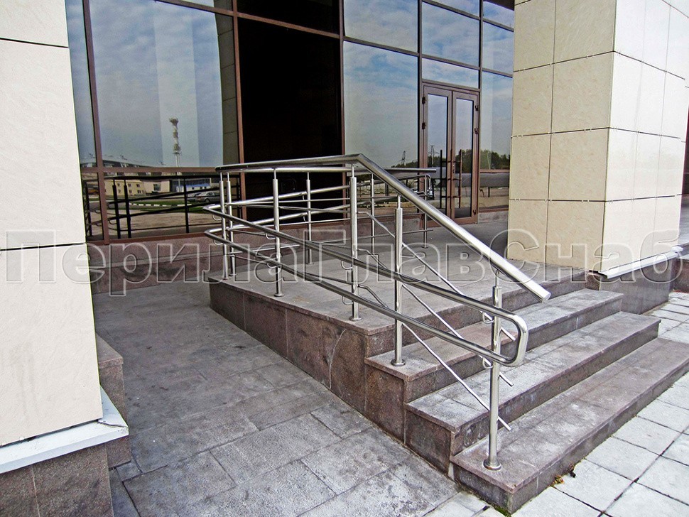 Ограждение лестницы из нержавеющей стали с дополнительным поручнем для инвалидов.Наконечники стоек в виде штырей, поручень для инвалидов крепится на выносных держателях.