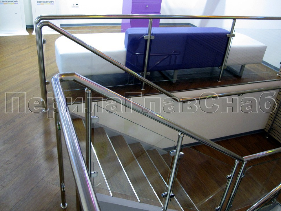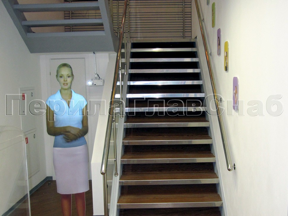 В качестве характерной особенности данного проекта следует отметить закаленное прозрачное стекло на зажимных стеклодержателях, установленное под наклоном в торец тонкого поребрика марша, а также облицовку ступеней лестницы деревом. При этом заказчик выразил желание облицевать торцы ступеней угловыми полосками нержавеющей стали для увеличения срока службы деревянной обшивки.