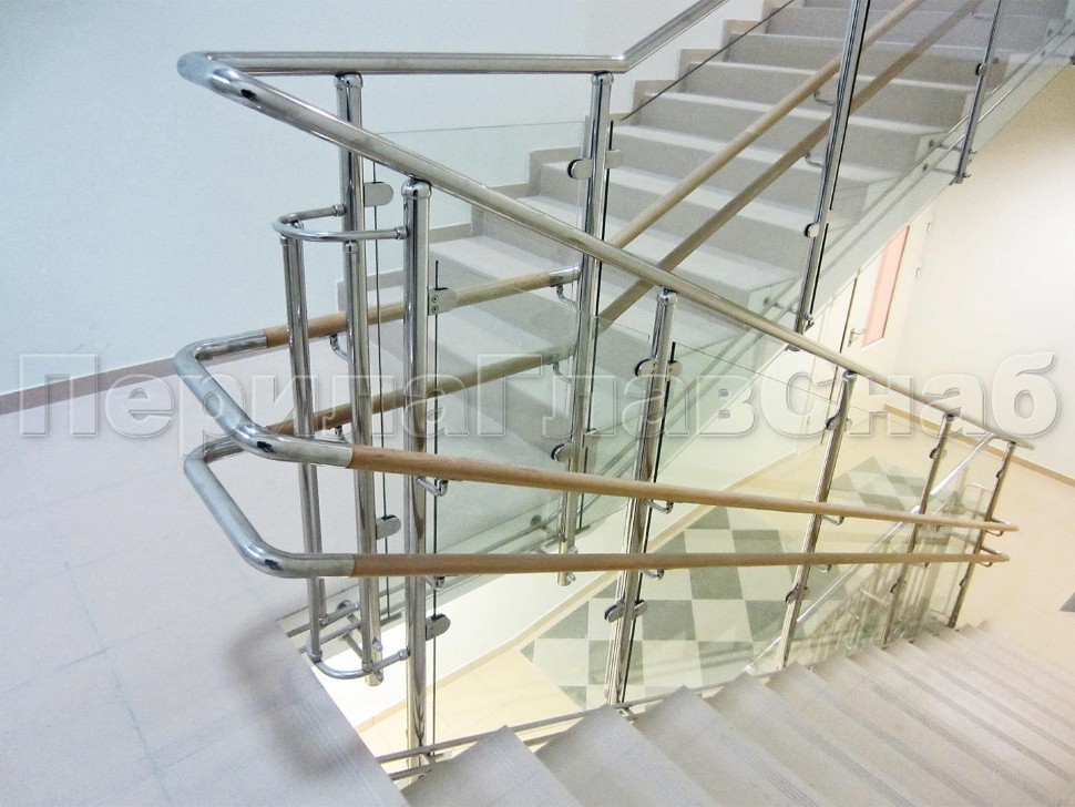 Ограждение со стеклом (на зажимных стеклодержателях) и стойками. Стойки установлены в торец ступеней. Поручни завязаны на поворотах.