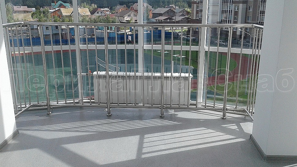 - Ограждения витражей зимних садов выполнены из полированной нержавеющей стали марки AISI 304 высотой 1200 мм от пола. Стойки трубой диаметром 38 мм крепятся в пол на глубину 70 мм при помощи бурения, установлены друг от друга на расстоянии 1000-1200 мм друг от друга. Между стоек вертикальным способом установлены ригели, диаметр трубки 16 мм. Вставляются в пазы перфорированной трубы с шагом 100 мм.
