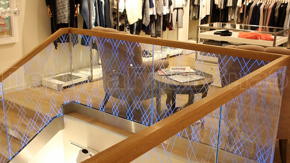 Поручень дубовый клееный по длине и толщине прямоугольный с пазом под стекло габаритами 60х40 мм с лаковым матовым покрытием в один слой. Поручень завязан на поворотах. На стекле с внешней стороны рисунок ромбов нанесенных методом пескоструйной обработки с покрытием защитным лаком. Ширина линий рисунка 5 мм.
