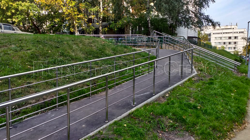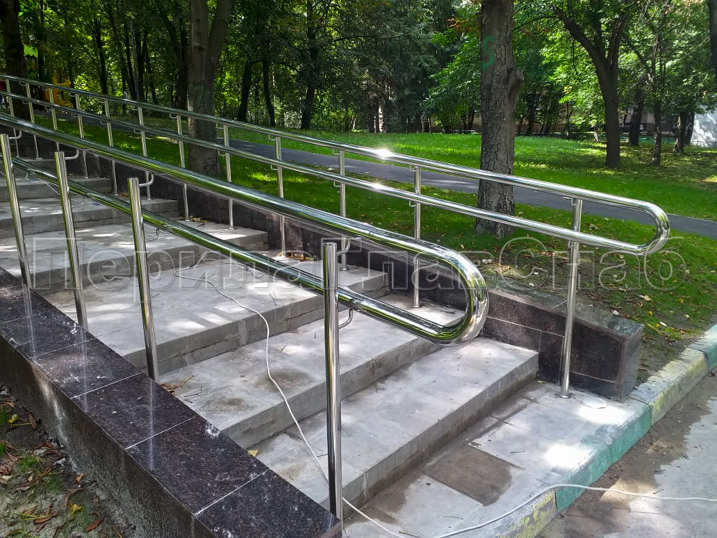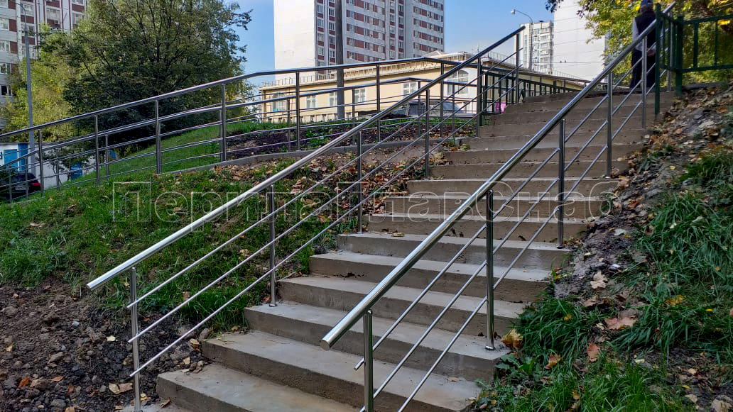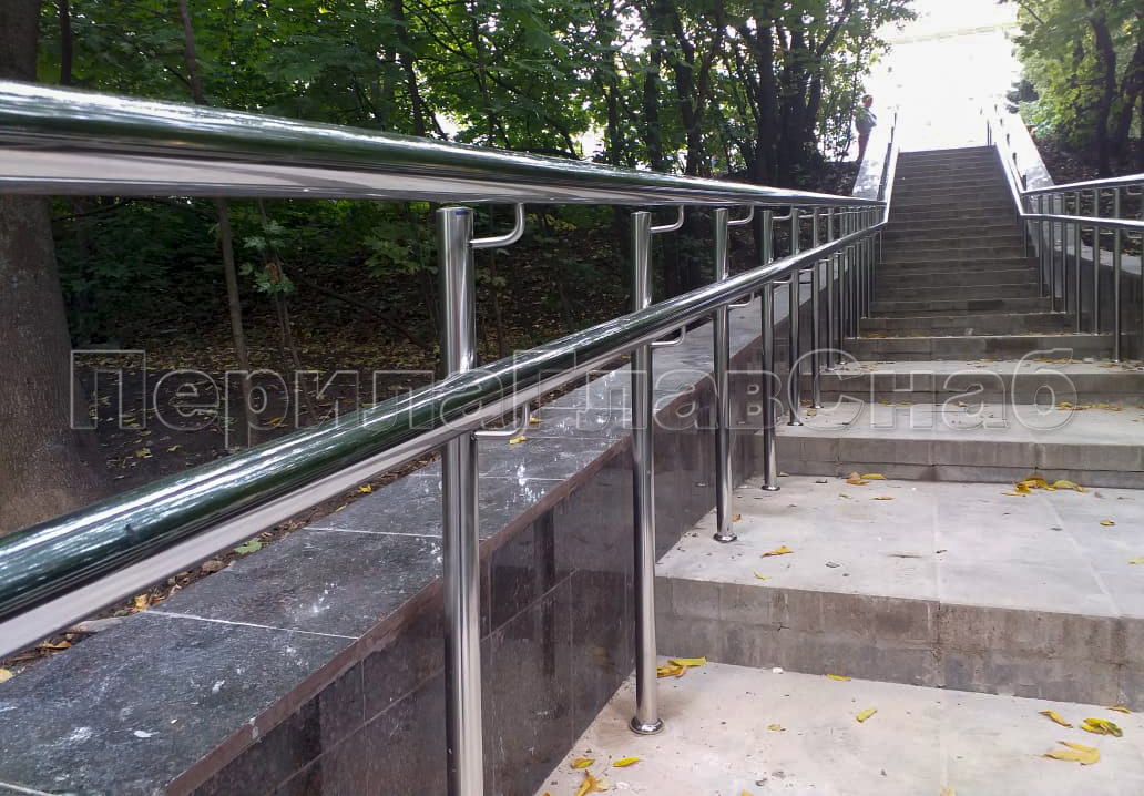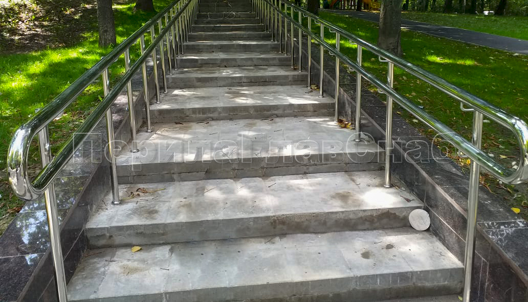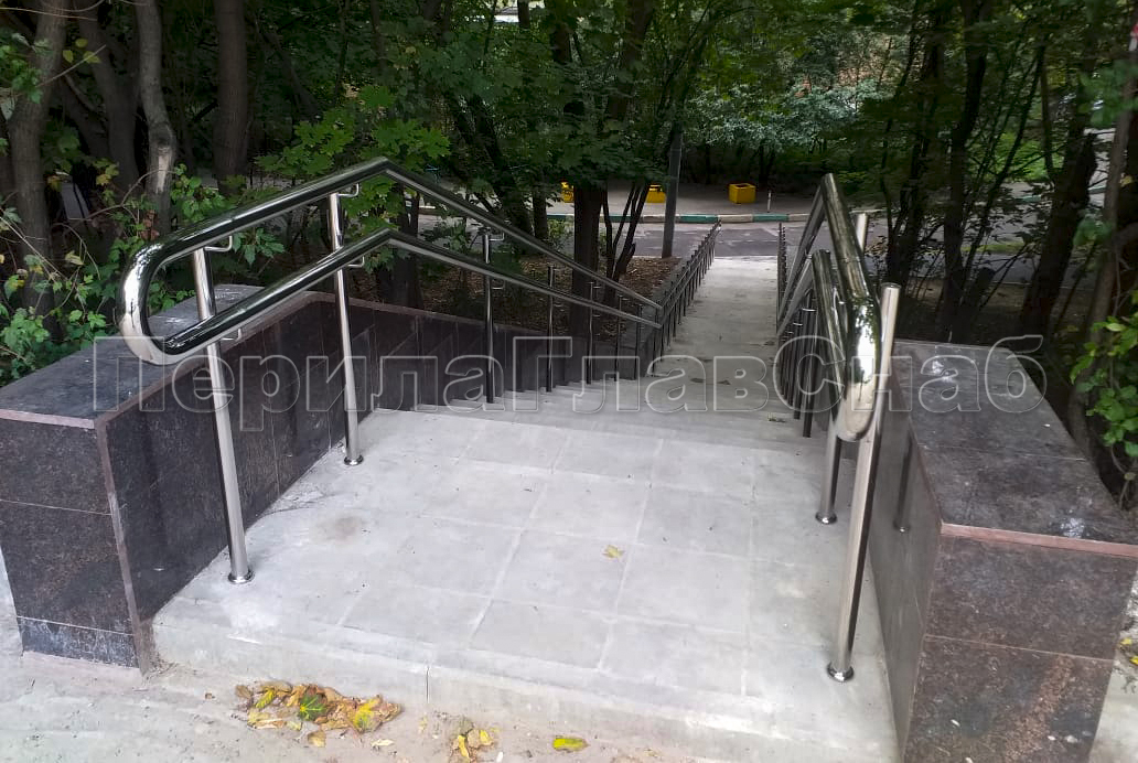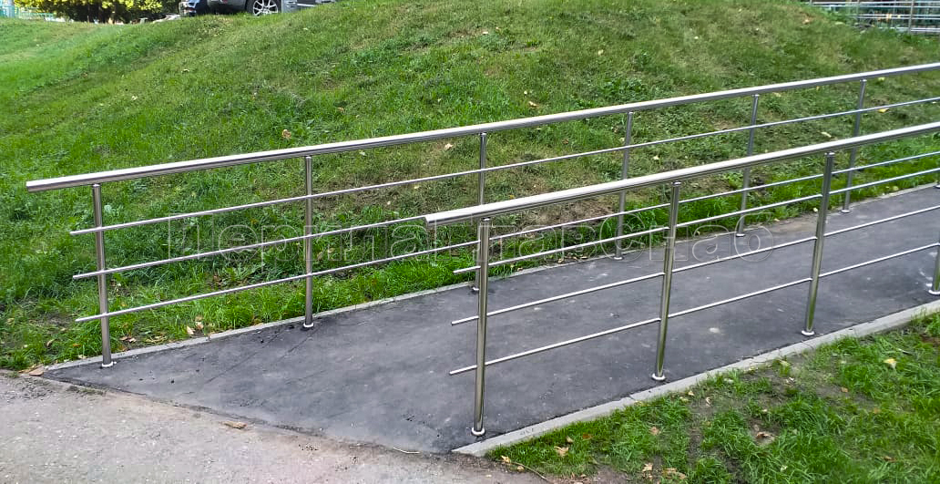 Наша компания «ПерилаГлавСнаб» выполнила заказ на изготовление и монтаж ста пятидесяти метров погонных ограждений из полированной нержавеющей стали, в рамках программы по благоустройству дворовых территорий города Москвы. Так как ограждения устанавливались на улице, мы использовали нержавеющую трубу и комплектующие марки стали Aisi 304. Ограждения состояли из следующего конструктива: