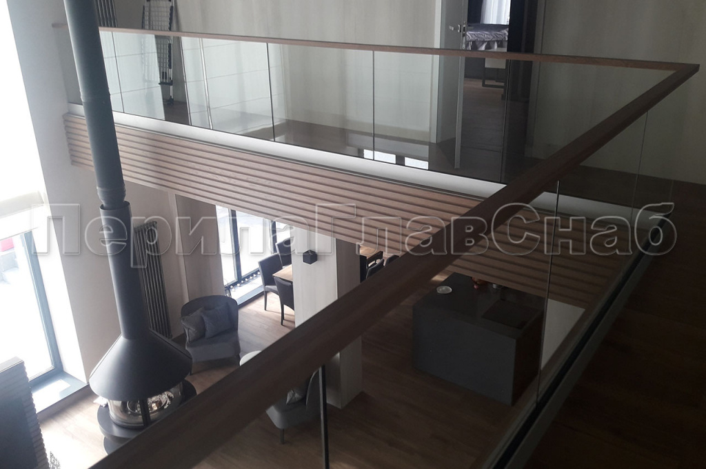 При завершении строительства дома, перед заказчиком встал вопрос о выборе ограждений в частный дом, находящийся в коттеджном поселке «АРТЭК». С просьбой помочь в выборе ограждений, в нашу компанию обратился непосредственно сам заказчик. Основным пожеланием заказчика было: ограждения должны быть прозрачными и в то же время безопасными. Мы предложили изготовить и смонтировать Цельностеклянные ограждения. Ограждение второго света имели следующий конструктив. Алюминиевый анодированный профиль, закаленное стекло толщиной 10мм с евро кромкой. Сверху на стекло был установлен поручень из массива дуба с пазом на стекло по индивидуальному размеру 60*40мм. Покраску поручня мы рекомендовали заказчику осуществить в той же компании, которая изготавливала декоративную деревянную отделку балками торца второго света.   На лестницу установили закаленное стекло толщиной 10мм, крепление стекла к косоуру лестницы было выполнено с помощью точечных креплений из шлифованной нержавеющей стали. В процессе монтажа ограждений у заказчика возникла потребность в изготовлении цельностеклянной перегородки. Так как наш профиль не ограничен одними лишь перилами, мы предложили свои услуги по установке цельностеклянной перегородки что сэкономило время и бюджет заказчика. Перегородка была выполнена из закаленного стекла толщиной 12 мм. Стекло крепилось через зажимной профиль в пол и потолок, в потолке предварительно была установлена закладная, для надежного крепления профиля. Так как полы были с подогревом, нам понадобилась схема укладки теплого пола, для того чтобы избежать повреждения кабеля нагрева при монтаже профиля. Работы по изготовлению и монтажу сорока метров погонных ограждений под ключ, были выполнены в течении двадцати пяти рабочих дней. В целом ограждения получились визуально легкими и зрительно не отягощали конструкцию лестницы.