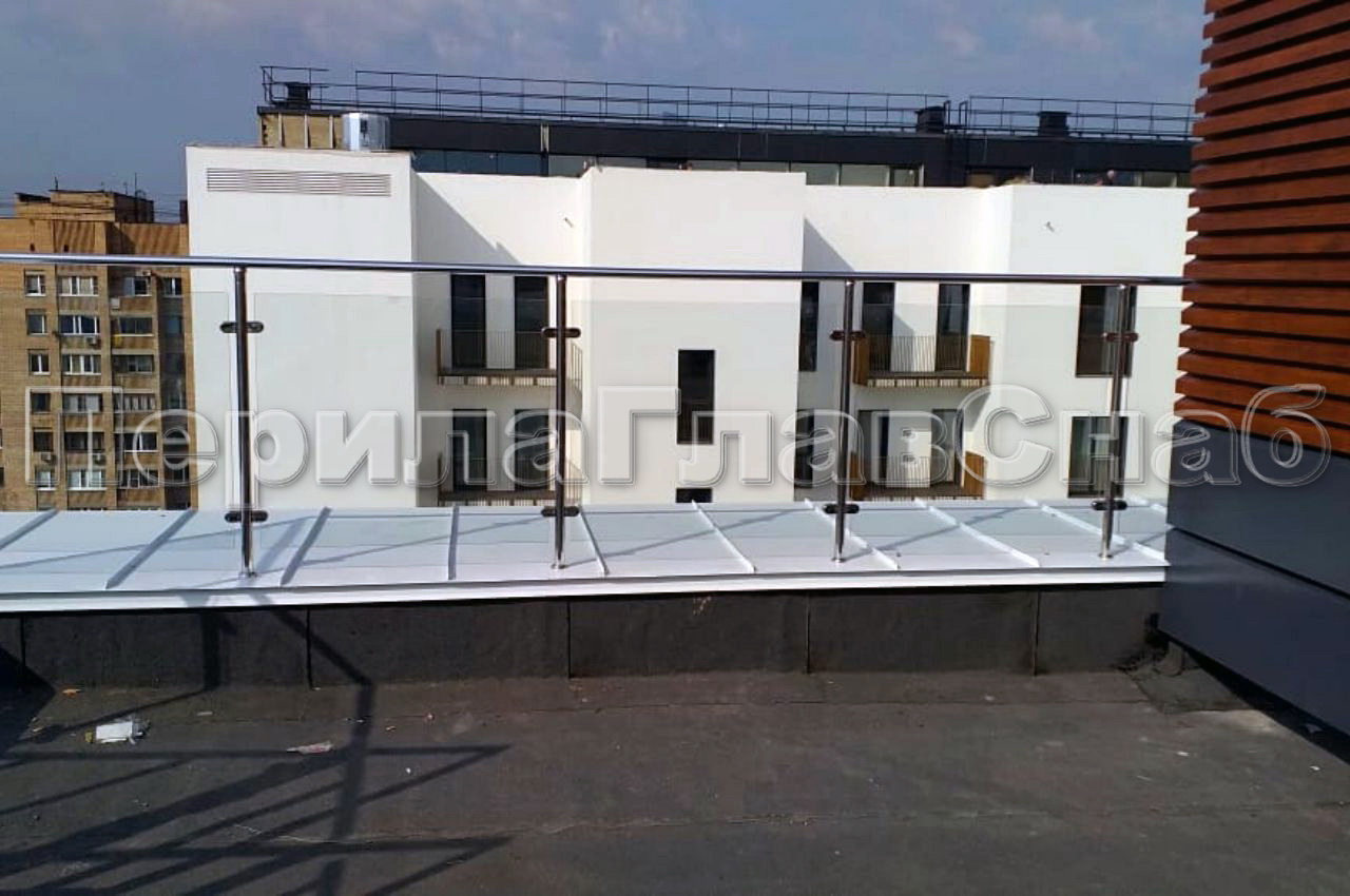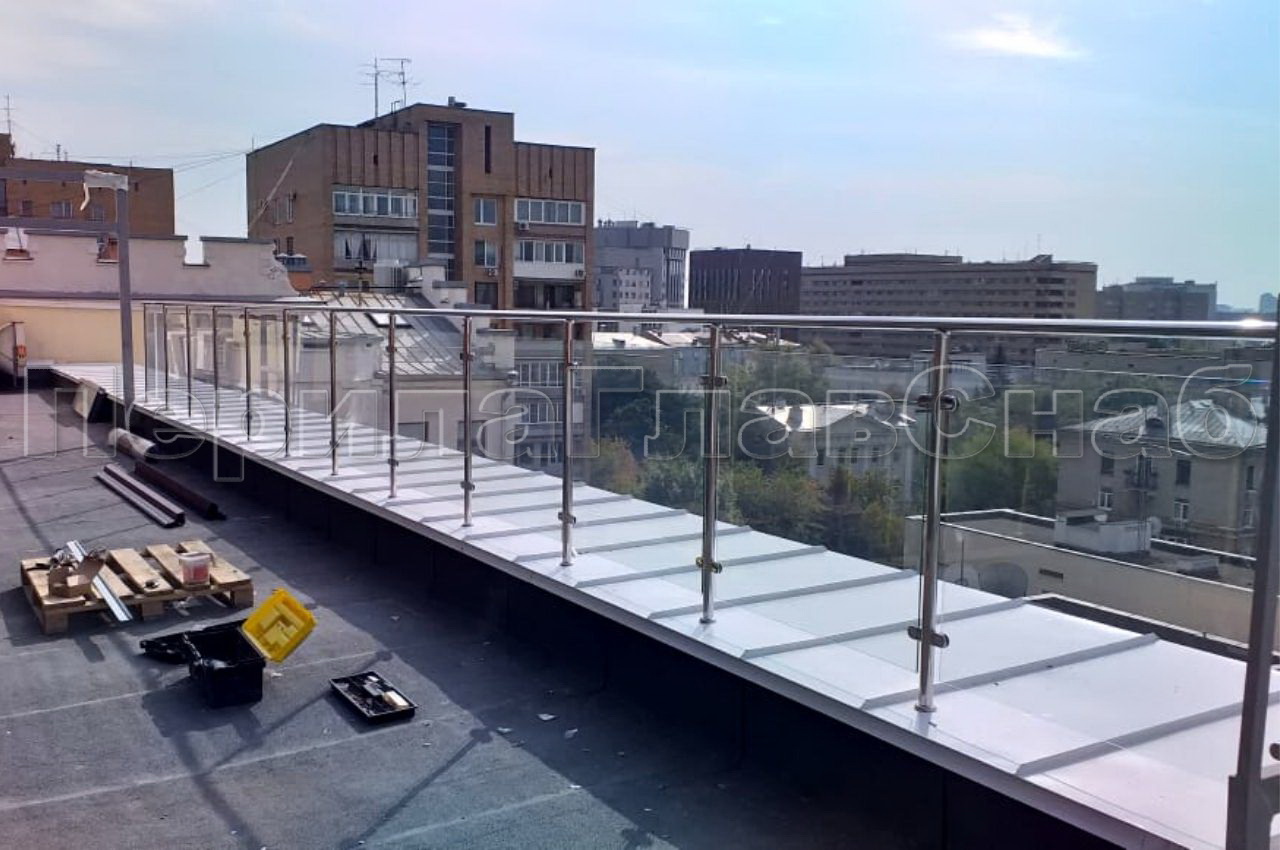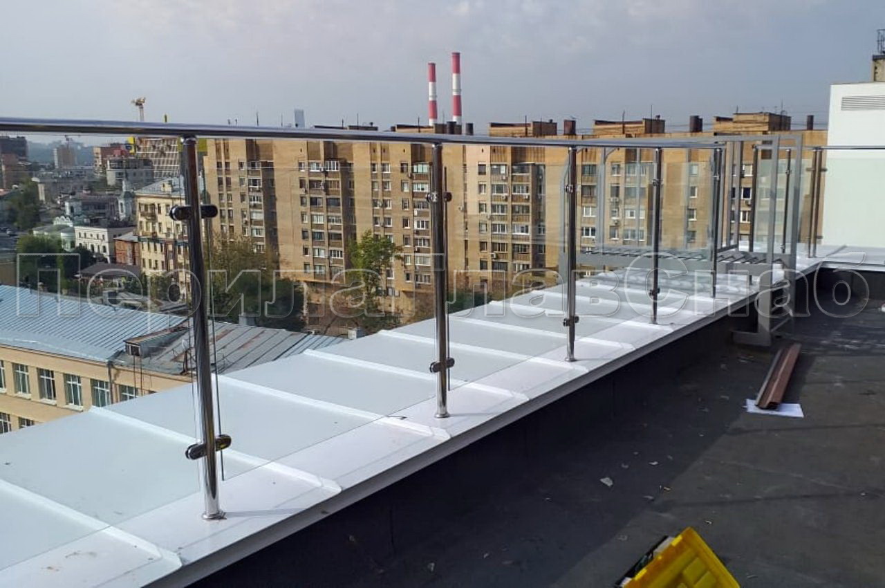 На Земледельческом переулке в Москве  компания ПерилаГлавСнаб установила ограждение для эксплуатируемой кровли. Клиент был ограничен в бюджете, при объеме работ в тридцать погонных метров, но очень хотелось легкости и прозрачности. В связи с этим было предложено следующее конструктивное решение. Стойки, поручень и фурнитура собственного производства были выполнены из нержавеющей стали с повышенной коррозийной устойчивостью для уличных видов работ. А заполнение между стойками выполнено из закаленного стекла толщиной 8 мм с нанесением защитной пленки в заводских условиях. Своего рода бюджетная альтернатива стеклу триплекс. Для жесткости перил на поворотах устанавливается по две стойки, а не по одной. Это чуть дороже по материалам и по работе, но такое минимальное увеличение бюджета, скорее инвестиция в функционал и безопасность. Ограждение монтируется в бетонное основание парапета через металлическую крышку. Отверстия в крышке обработаны силиконом для герметичности. Глубина бурения 200 мм , труба вклеивается на специальную смесь. Все эти меры в купе позволяют дать заказчику хорошую гарантию. Ветрозащитное ограждение изготовлено, установлено и сдано заказчику за две недели в срок, как и было оговорено в договоре.