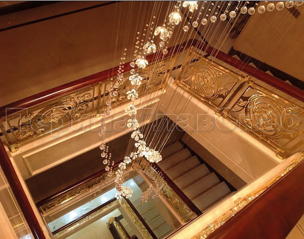 Ограждение лестницы на квадратных стойках с латунным поручнем