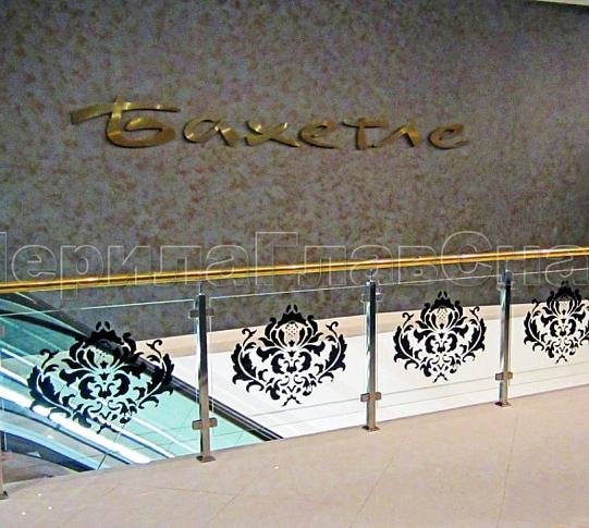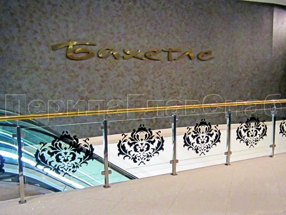 Ограждение лестницы с прозрачным стеклом, стойками и поручнем из латуни