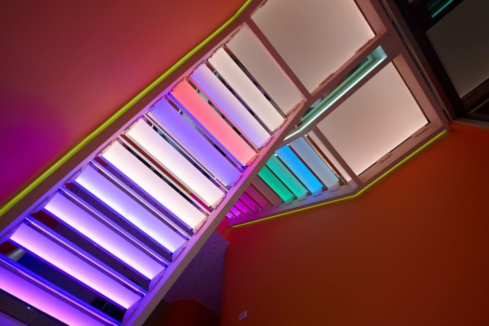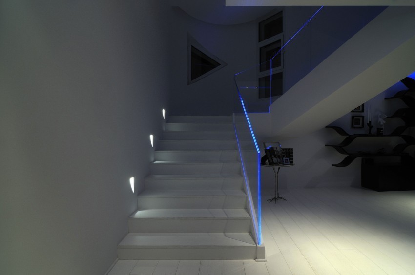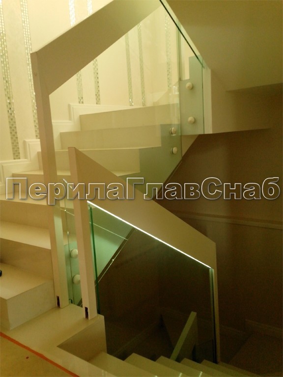 Хорошее практическое применение дает подсветка в дополнительном выносном поручне. В таком виде подсветки хорошо освещаются как поручень и стекло, так и ступени или внутреннее пространство, огражденное стеклом. Очень часто различные виды размещения комбинируют, например, используют подсветку в профиле и подсветку в дополнительном поручне.
