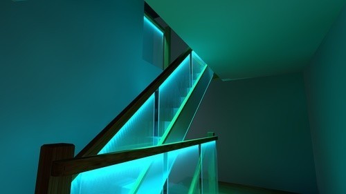 В базовой модели используется лента с LED-светодиодами для подсветки, мощностью не более 4,8Вт/м. Для более яркого освещения можно заказать ленту с мощностью 6 и более Вт/м (есть выбор из 10-и видов светящихся светодиодных лент с различными характеристиками). Подсветка может быть рассеяно-белой или цветной. В цельностеклянных ограждениях можно размещать подсветку в несущем профиле (базово) для подсветки снизу. Такая подсветка дает ровный рассеяный свет, окрашивает (как бы маркирует) стеклянные перила. Можно размещать подсветку перил в трубе с пазом, которая используется как основной поручень. Можно размещать подсветку под п-образным профилем, закрывающим кромку стекла. Такие виды подсветки окрашивают несущее стекло сверху и играют роль декоративной подсветки.