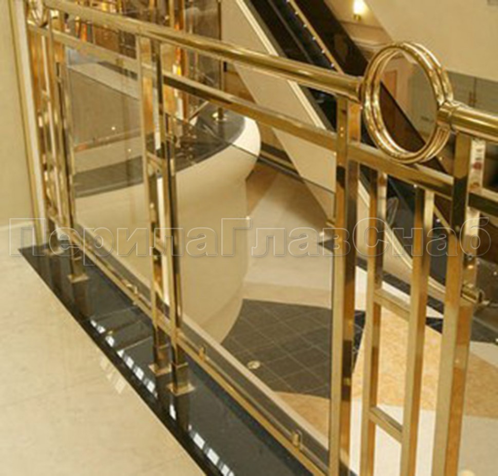 - Ограждение лестницы с прозрачным стеклом, стойками и поручнем из латуни
