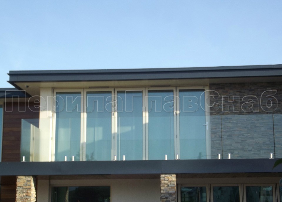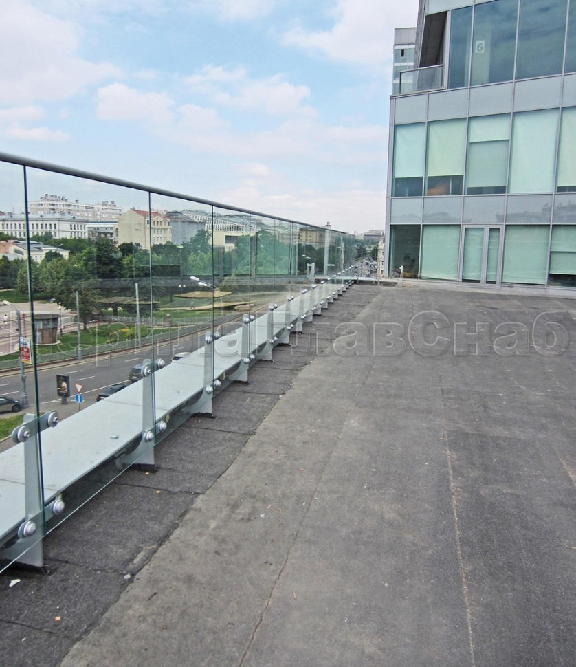 Несущая функция перераспределена между стеклом и стойками крепления. Высота ограждения может быть разной, в зависимости от высотности здания и наличия парапета (и его высоты).